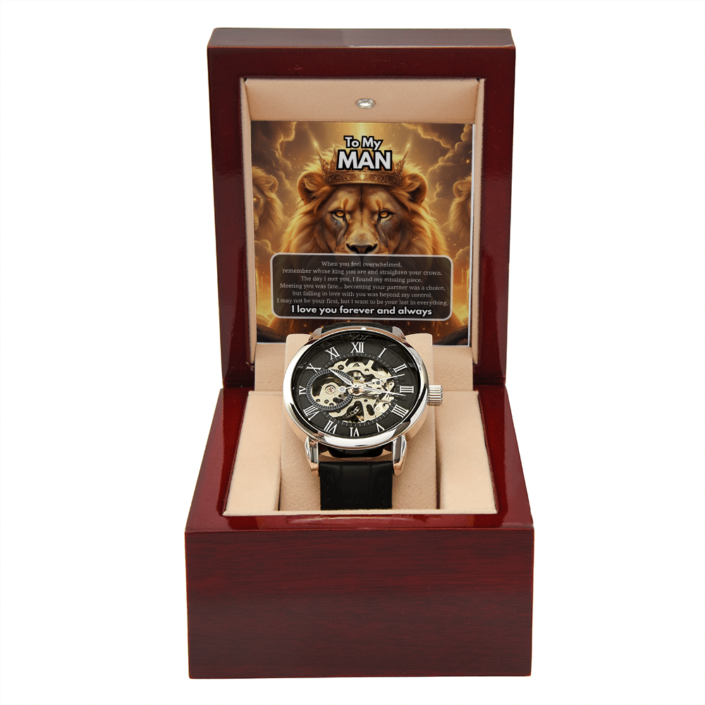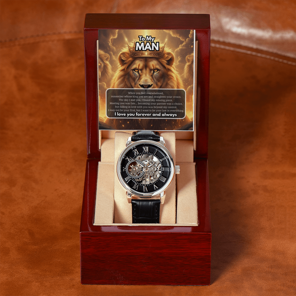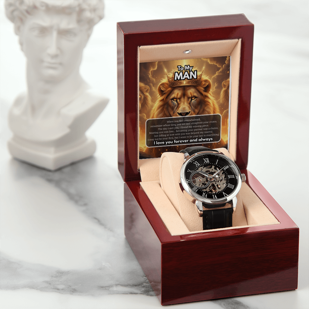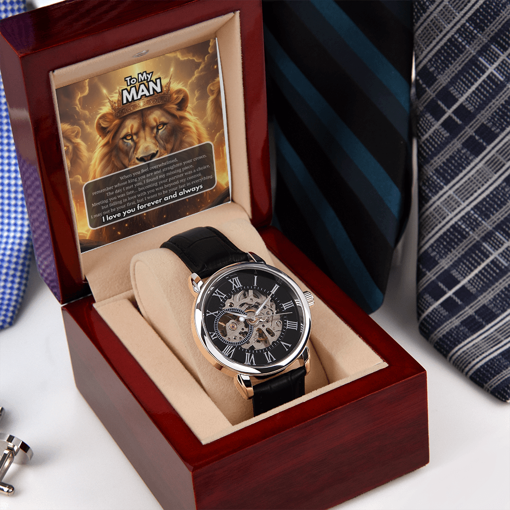 Give the gift of luxury with this handsome and daring timepiece. The Men's Openwork Watch is the perfect blend of classic design and modern styling, making it an essential accessory for your remarkable style. This watch sports a genuine leather strap, is splash resistant, and has increased durability thanks to hardened mineral glass. Our unique skeleton dial feature allows you to peer directly into the inner workings of your watch. Beautifully crafted to be automatic,  this watch requires motion instead of batteries. You will keep precise time simply by wearing it, no winding necessary. This magnificent piece makes the perfect gift for yourself or any man in your life looking to add a tasteful element into his wardrobe.