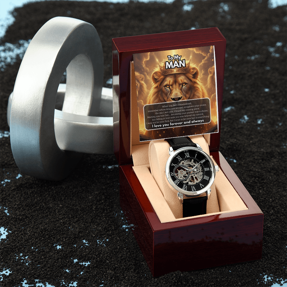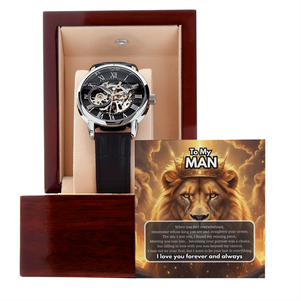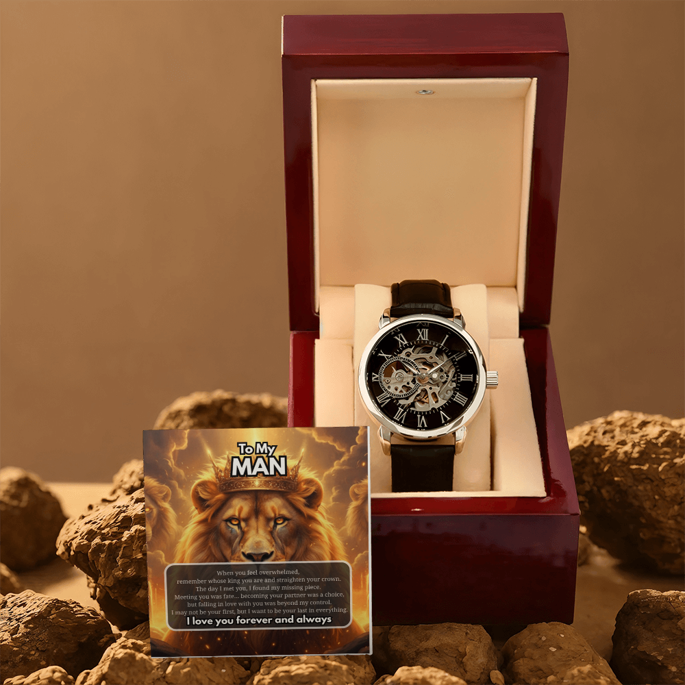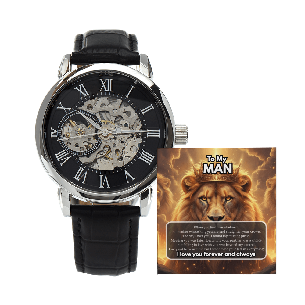Give the gift of luxury with this handsome and daring timepiece. The Men's Openwork Watch is the perfect blend of classic design and modern styling, making it an essential accessory for your remarkable style. This watch sports a genuine leather strap, is splash resistant, and has increased durability thanks to hardened mineral glass. Our unique skeleton dial feature allows you to peer directly into the inner workings of your watch. Beautifully crafted to be automatic,  this watch requires motion instead of batteries. You will keep precise time simply by wearing it, no winding necessary. This magnificent piece makes the perfect gift for yourself or any man in your life looking to add a tasteful element into his wardrobe.